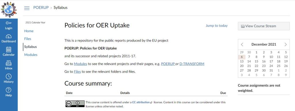 Responding to demand from researchers and policy analysts we are gradually copying all the public reports from the EU-funded POERUP project and all our associated OER-relevant projects onto a repository called Policies for OER Uptake. This is hosted on the Canvas LMS which we use for much of our teaching and content development for ourselves and clients.